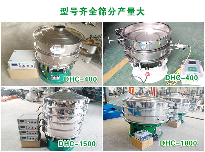 超聲波旋振篩型號齊全產(chǎn)量大,型號有DHC-400、DHC-600、DHC-800、DHC-1000、DHC-1200、DHC-1500、DHC-1800、DHC-2000等,材質(zhì)可選擇不銹鋼、碳鋼材質(zhì)。還可根據(jù)不同需求特殊定制(加高加緣、安裝進(jìn)料斗等)。相同型號產(chǎn)量比普通旋振篩產(chǎn)高10-15倍。